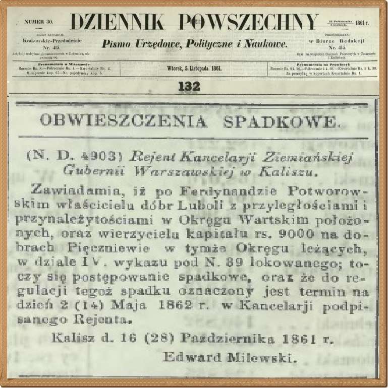 W sądzie okręgowym kaliskim na licytacji publicznej sprzedane zostały dobra Lubola, w pow. tureckim, obejmujące około 300 wiorst.