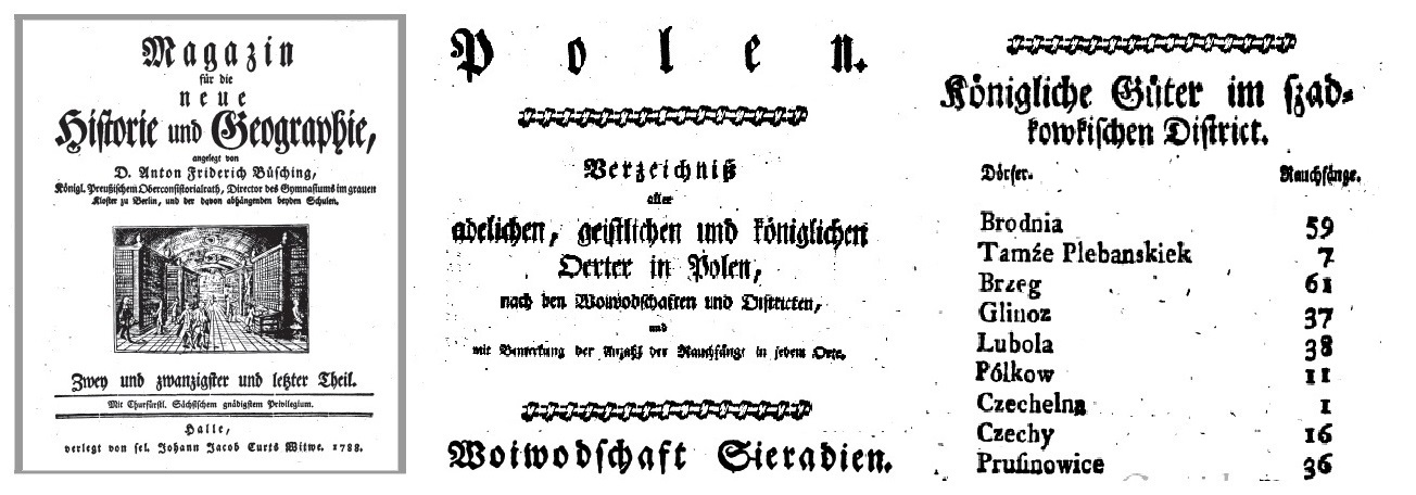 Po pierwszym rozbiorze Polski został zrobiony wykaz wszystkich miejscowości w Polsce, z podziałem na dobra szlacheckie, duchowne i królewskie, według prowincji i okręgów z przypisaną ilością kominów w danej miejscowości. Wykaz ten został opublikowany w wydawanym co rok periodyku :