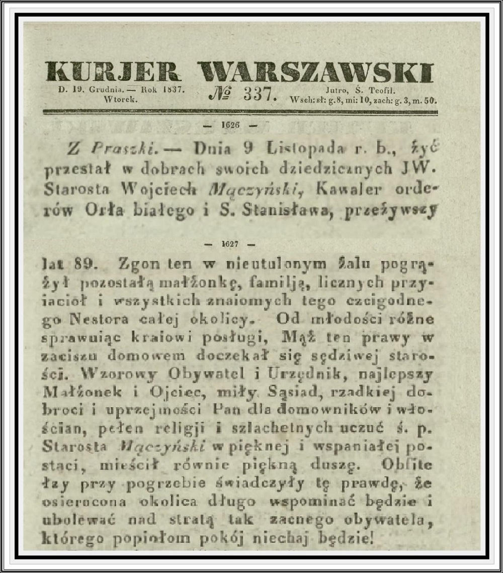 Mączyński Wojciech Józef Onufry, herbu Świnka, s. Aleksandra i Joanny Trepka - *1758, † 1837, po ojcu starosta lubolski, kawaler orderu św. Stanisława, Orła Białego. Prezes Rady Departamentu Kaliskiego. Dziedzic miasta Praszki z przyległymi wsiami. Szambelan JKM, poseł na sejm Wielki. Należał do najbogatszej i najbardziej oświeconej grupy szlachty wieluńskiej. Popierał rozwój rzemiosła, interesował się eksploatacją rud żelaza. ślub w 1801 Wrocław - Albertyna Wilhelmina Seydlitz. † 1808. {©}