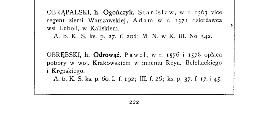 OBRĄPALSKI, herbu Ogończyk, Adam, w roku 1571 dzierżawca wsi Luboli w Kaliskiem.