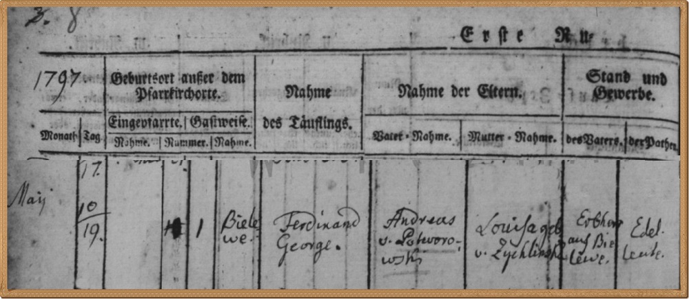 Chrzest dziecka włodarza z Luboli: Rodzicami Chrzestnymi byli - Klemens Krenn i Antonina Moczydłowska.   {©}