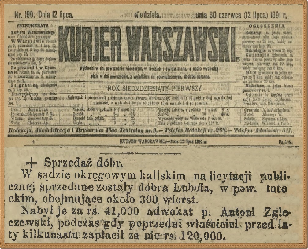 W sądzie okręgowym kaliskim na licytacji publicznej sprzedane zostały dobra Lubola, w pow. tureckim, obejmujące około 300 wiorst. Nabył je za rs. 41,000 adwokat p. Antoni Zgleczewski, podczas gdy poprzedni właściciel przed laty kilkunastu zapłacił za nie rs. 120,000.